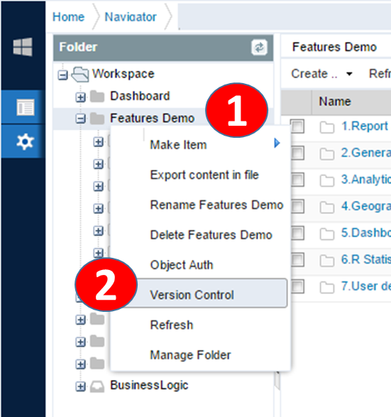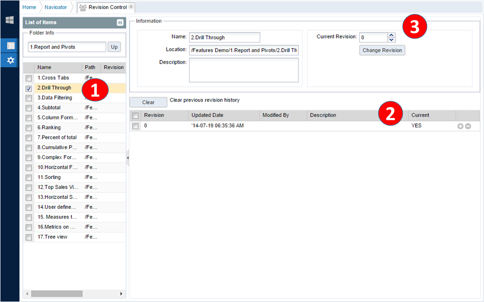 버전 관리는 네비게이터에서 폴더 혹은 개별 항목을 선택한 후 마우스 오른쪽 버튼을 클릭, 팝업 메뉴에서 버전 관리를 클릭하면 세부 항목의 개정 정보를 확인 할 수 있다. 특정 버전 정보로 항목을 복구하기 위해서는 항목을 클릭 후 복구 버튼을 클릭하면 해당 버전으로 복구된다.