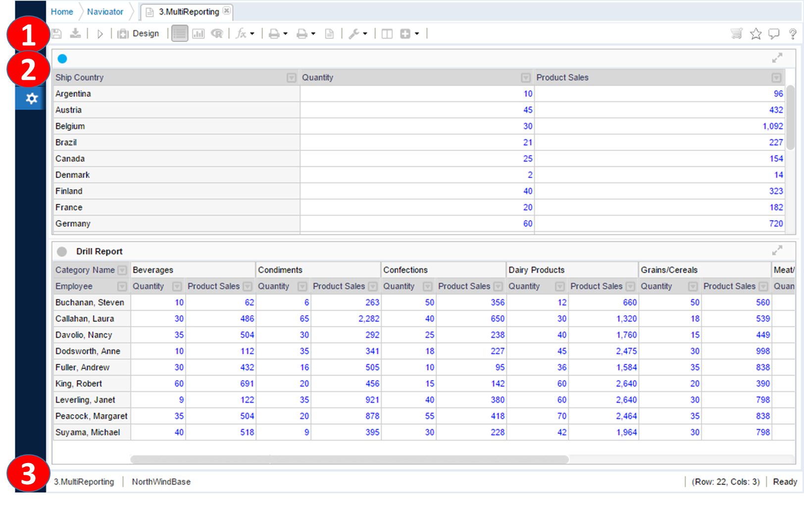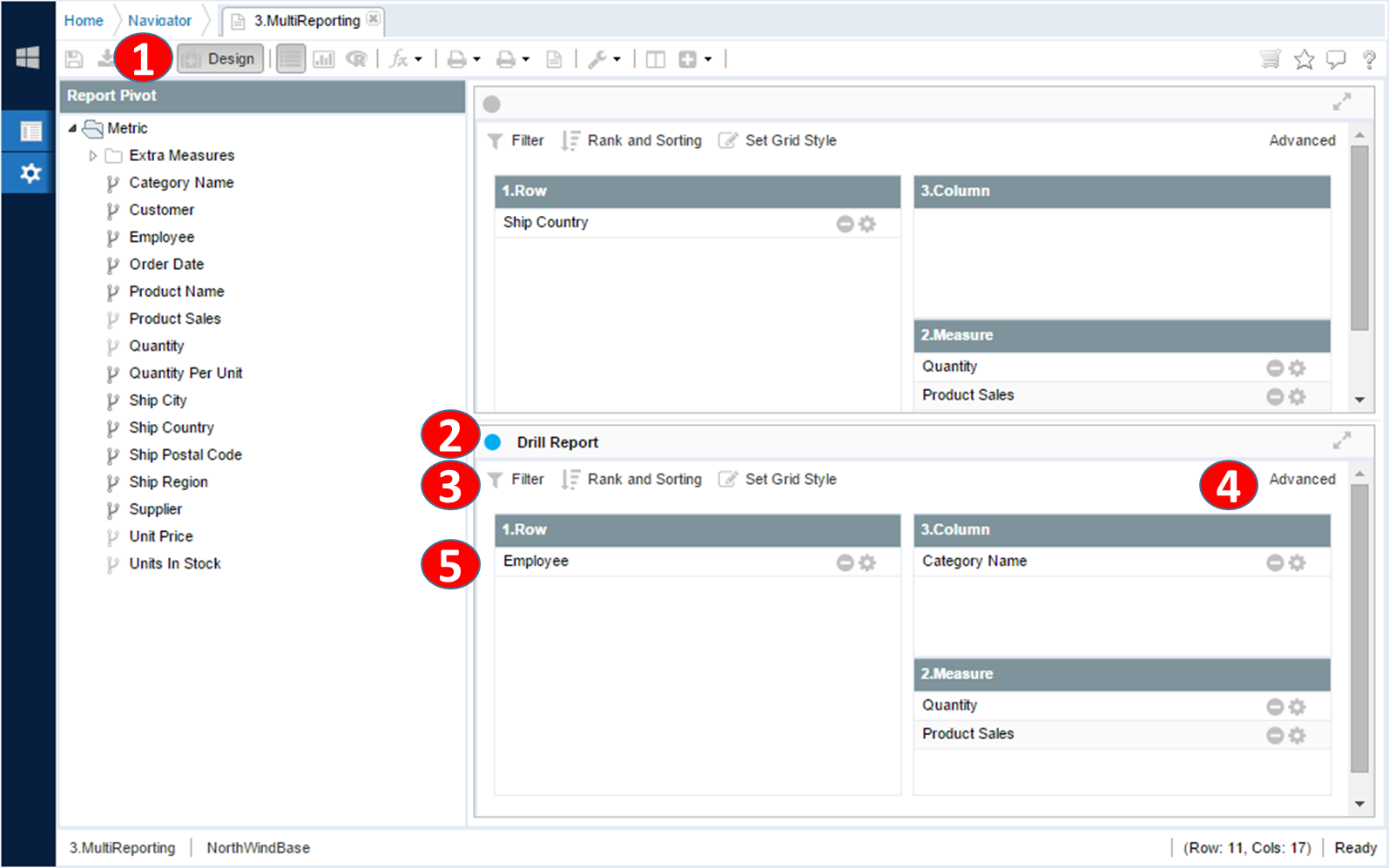 리포트 툴바의 디자인 모드를 클릭하여 리포트 피봇 및 상세 옵션에 대한 변경을 위한 디자인 모드로 변환한다.