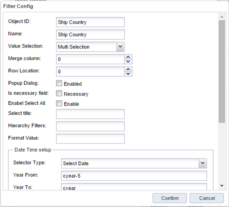 Specify the hierarchy of filters that should be selected first For example, in case of country name, city name, and city details, a country name is assigned to the city name filter, and if the country name and city name are specified in the city details field, When city name is selected, city details corresponding to city and country name are displayed. |