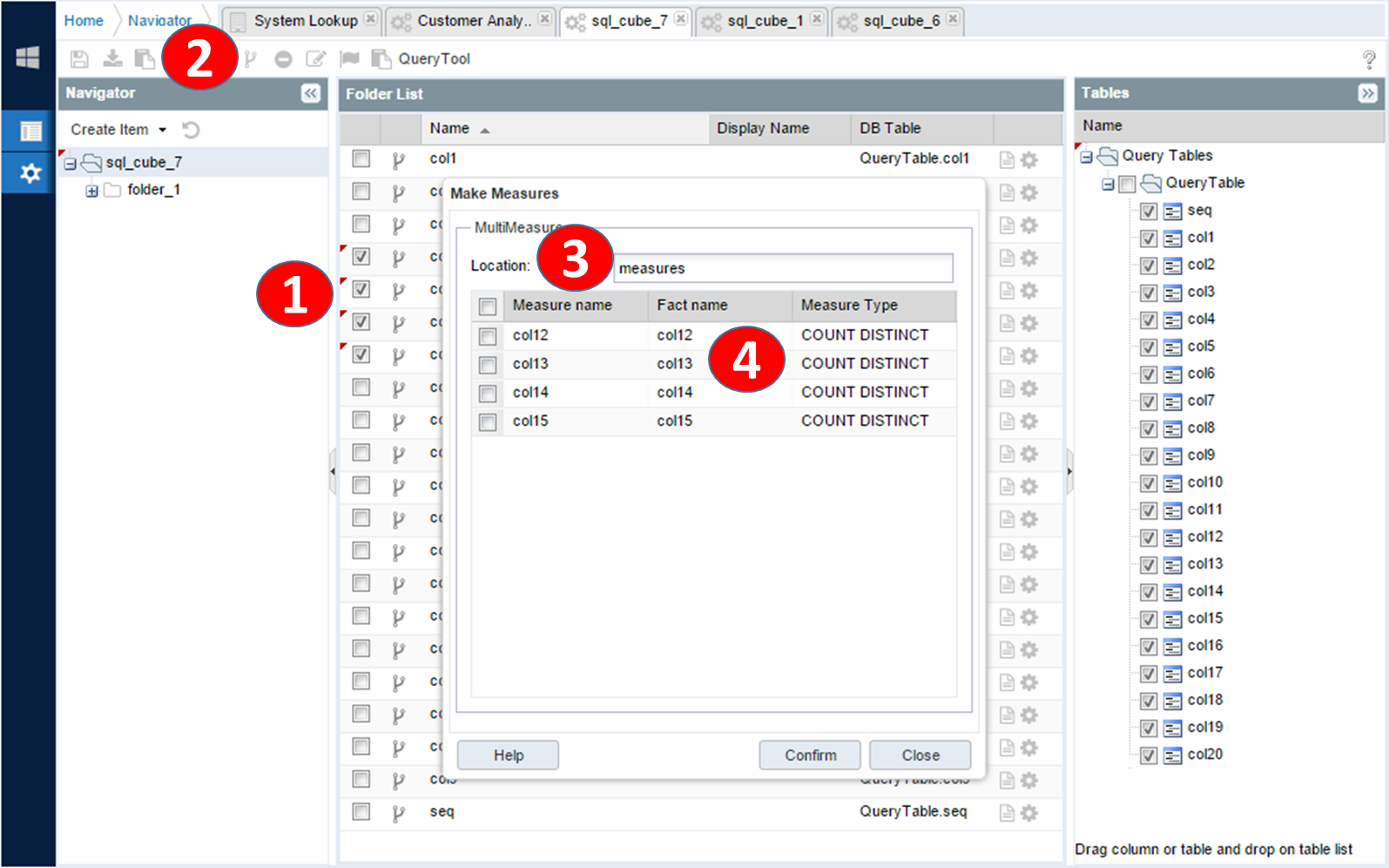 개별적인 메져의 등록은 네비게이션 폴더의 항목 생성 버튼을 통해 가능하다. 네비게이션 패널의 항목생성 메져를 선택하여 신규 메져를 생성한 다음 상세 편집 한다.