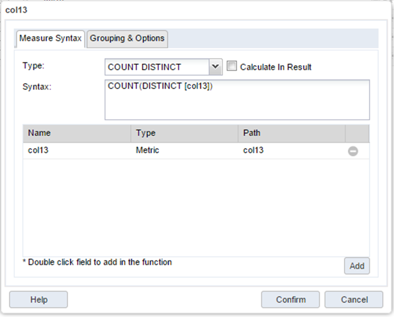집합함수의 유형을 선택한다. 집계 함수 목록에 없는 경우 Custom 을 선택한후 Syntax 에 직접 수식을 입력한다. |
