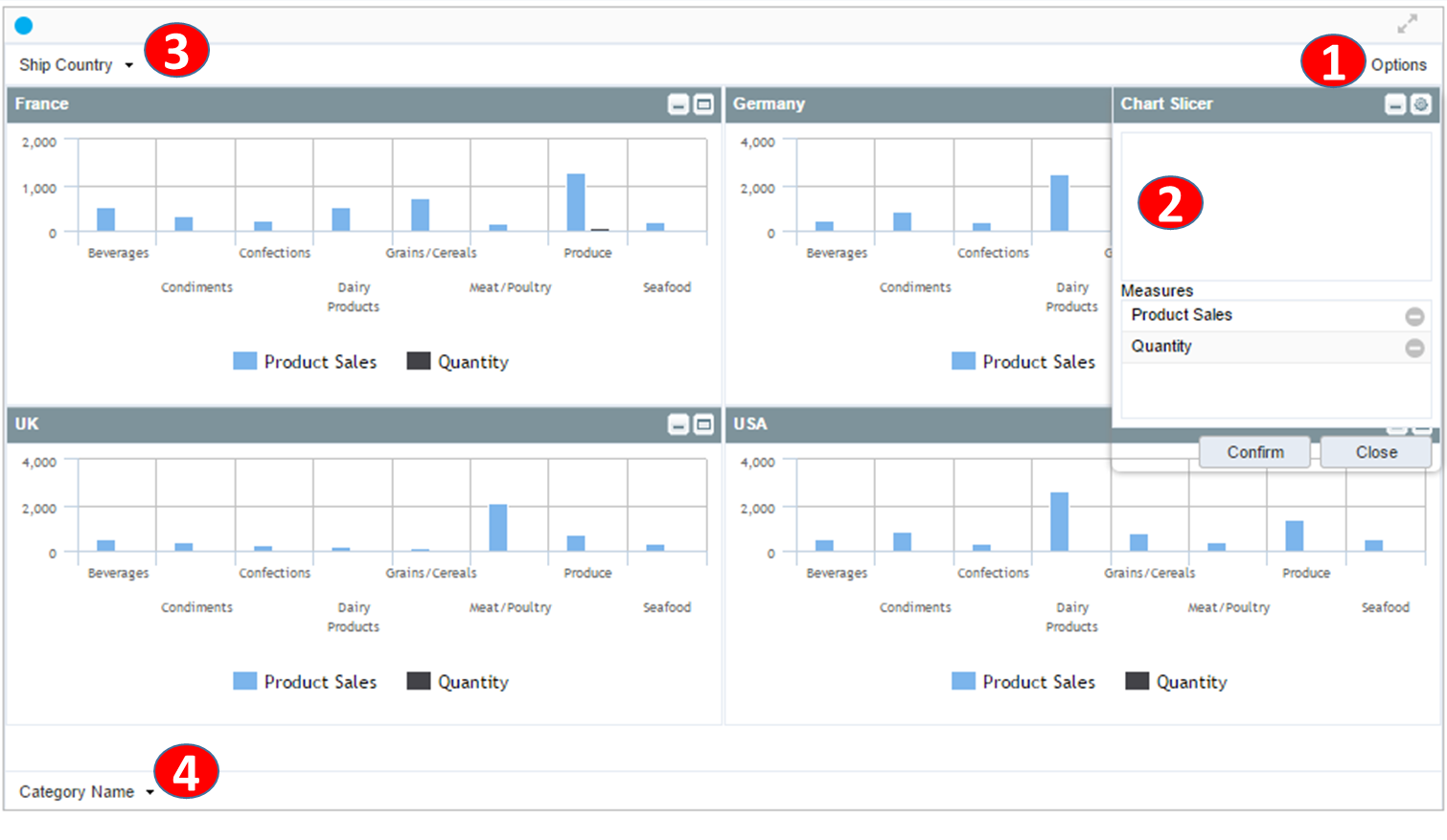 슬라이싱 디멘젼 영역: 챠트를 나눌 기준 디멘젼을 드래그 드랍한다. 예로 국가 디멘젼을 추가하는 경우 챠트는 각 세부값 USA, Canada, Mexico으로 구분된 복수개의 챠트 위젯이 추가된다. |